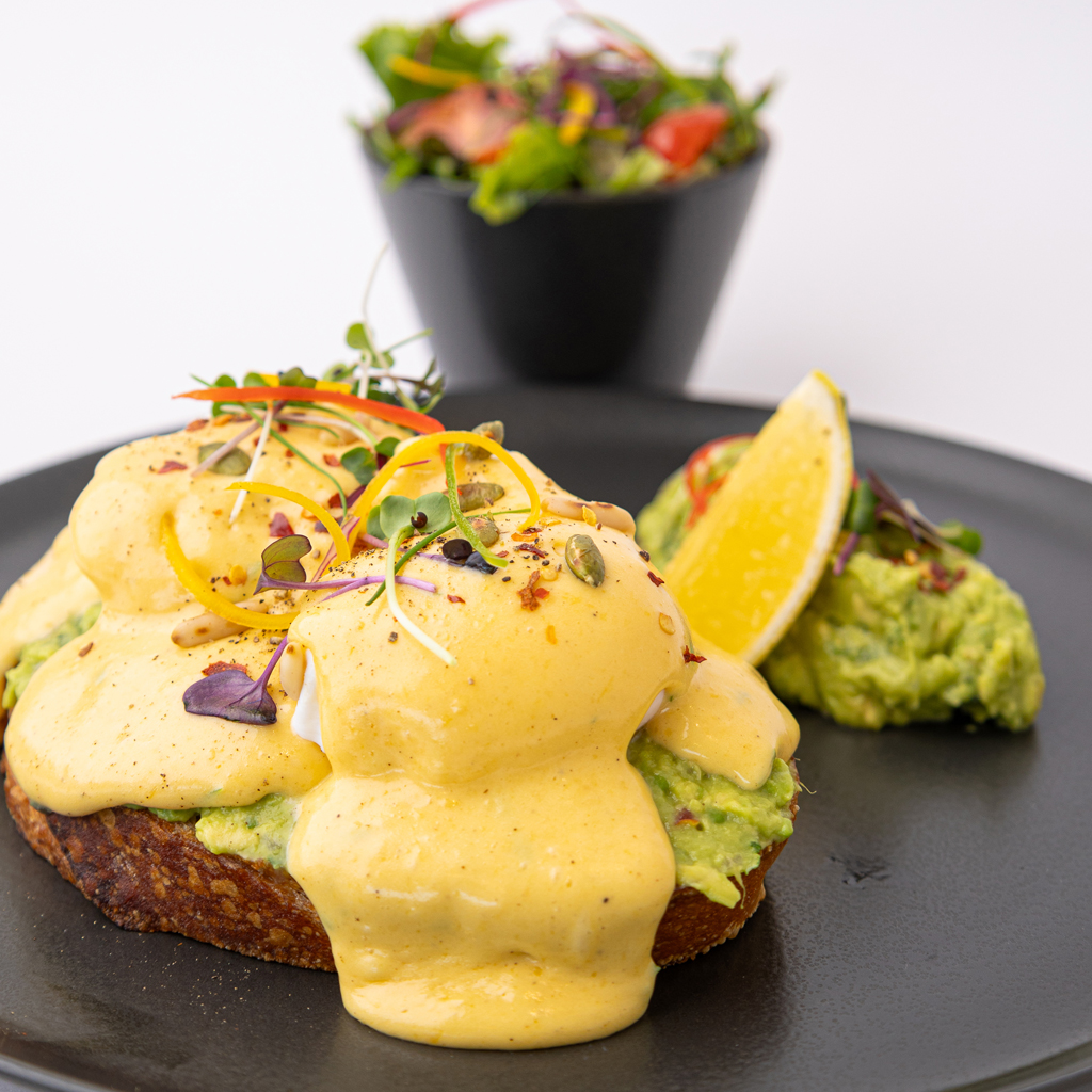 Slice of toasted sourdough bread layered with mashed avocado, poached eggs with toppings such as hollandaise sauce.