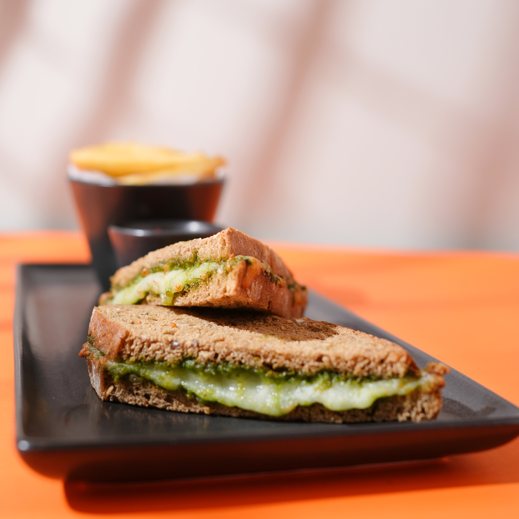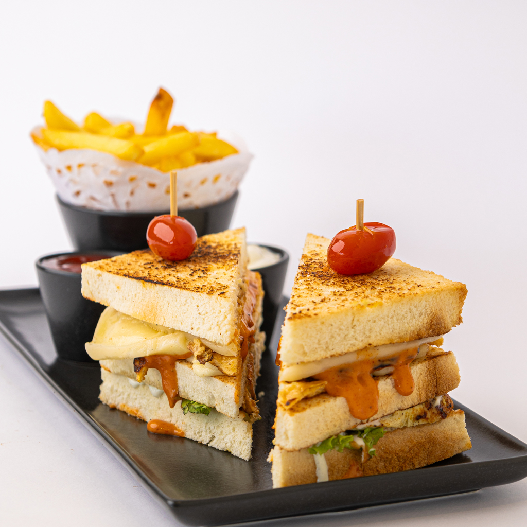 Toasted bread with grilled chicken, turkey bacon, fried egg. lettuce. tomato ketchup and mayonnaise. Paired with a side of french fries.