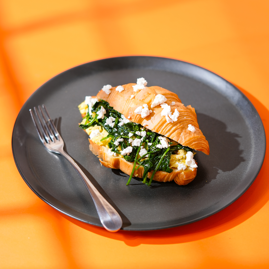 Warm croissant filled with poached eggs and baby spinach and adorned with hollandsise sauce. Served alongside al