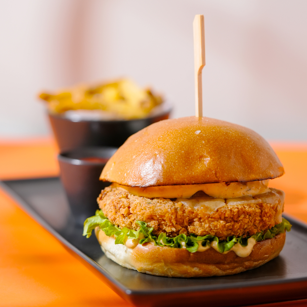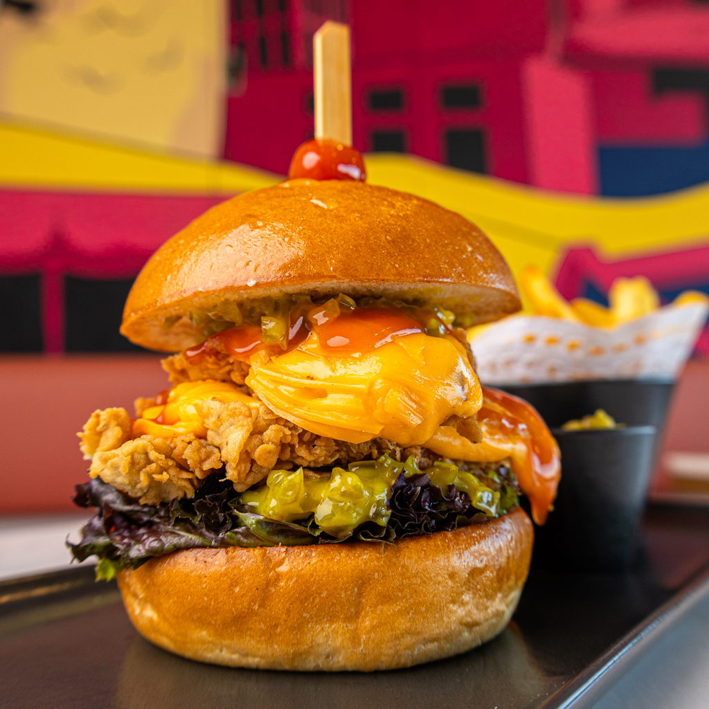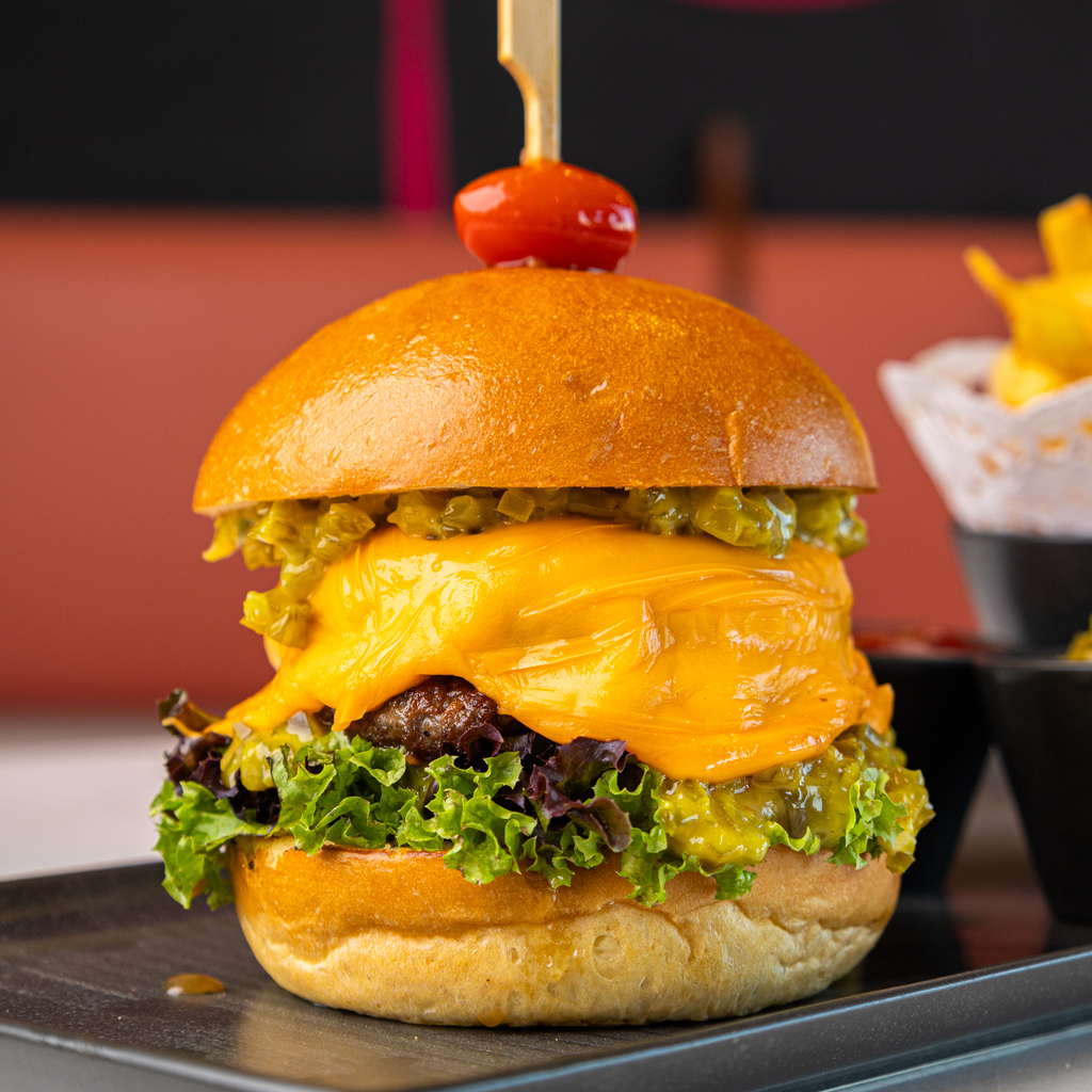 Tender wagyu beef piled into a soft brioche bun and topped with classic accompaniments like melted cheese, with jalapenos, lettuce and tomato ketchup. Served alongside french fries.