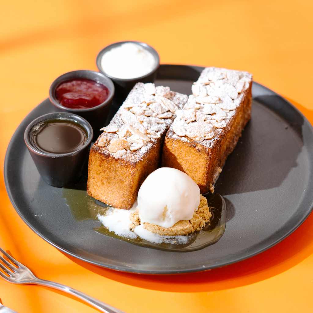Crunchy toasted brioche bread soaked in beaten eggs with fresh milk and coated with a crispy layer of crushed cornflakes. It’s often topped with mixed berries.