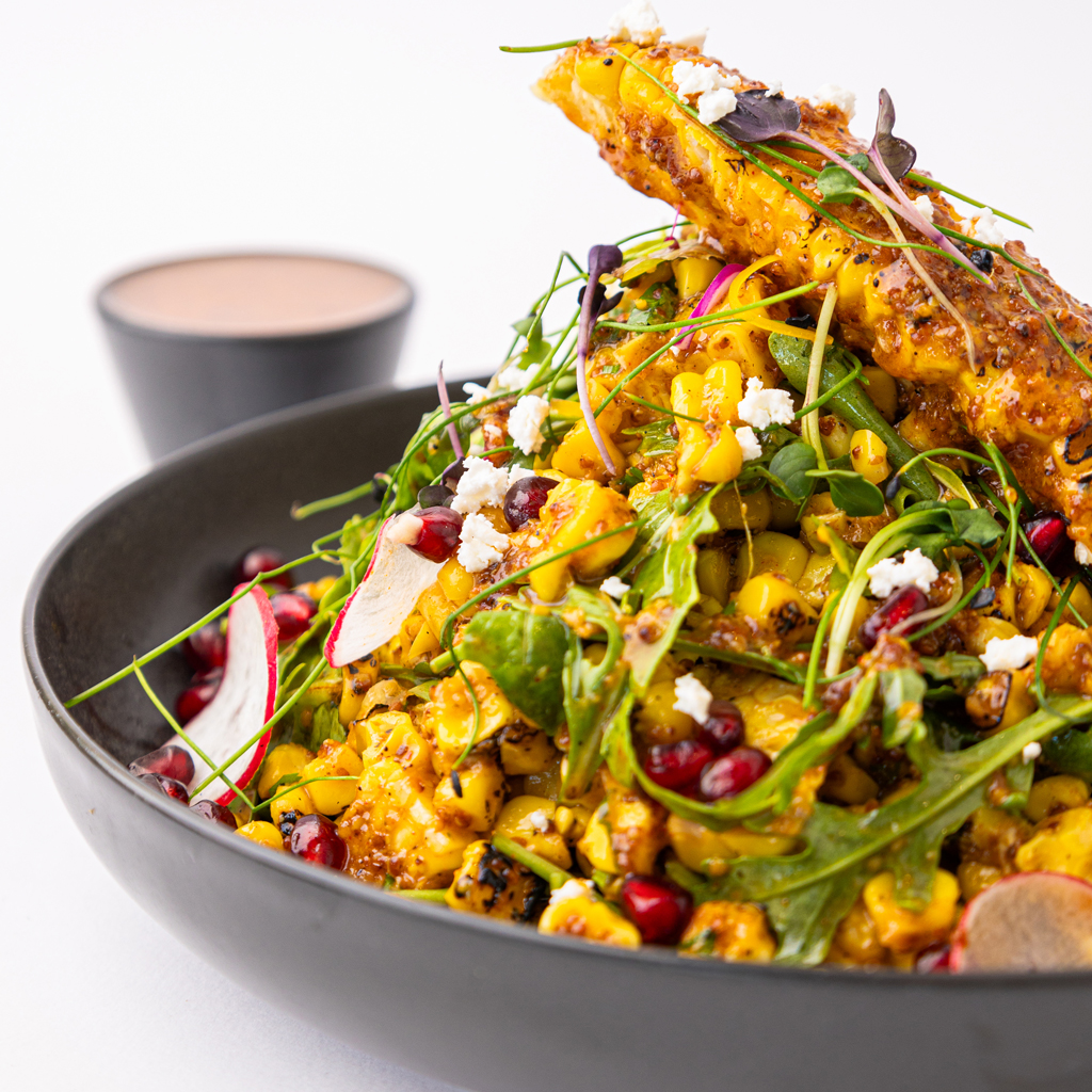 Grilled corn on a bed of rocket leaves. pomegranate seeds, chives, parsley, coriander, mint, spring onion and
