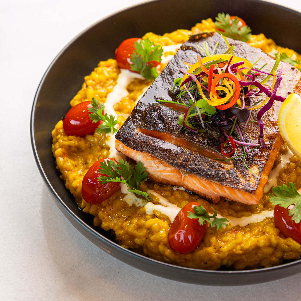 Soft and tender grilled chicken with machsotto cooked with dry lemon and emirati ghee topped with slow-cooked cherry tomatoes.