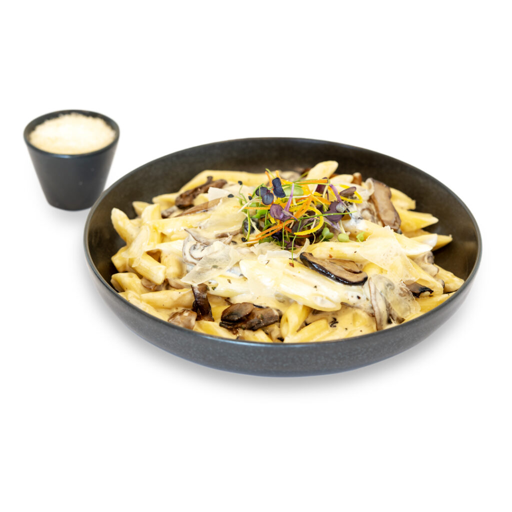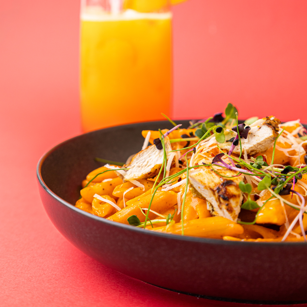 Penne pasta tossed ni a creamy tomato sauce. The sauce, often made with a blend of tomato sauce, cream and parmesan