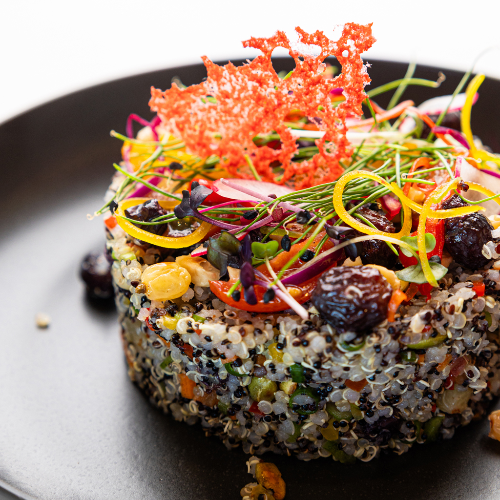 Delicious boiled quinoa mixed with sakura, hazelnuts, lemon dressing. tomatoes, cucumbers, raisins and bell peppers.