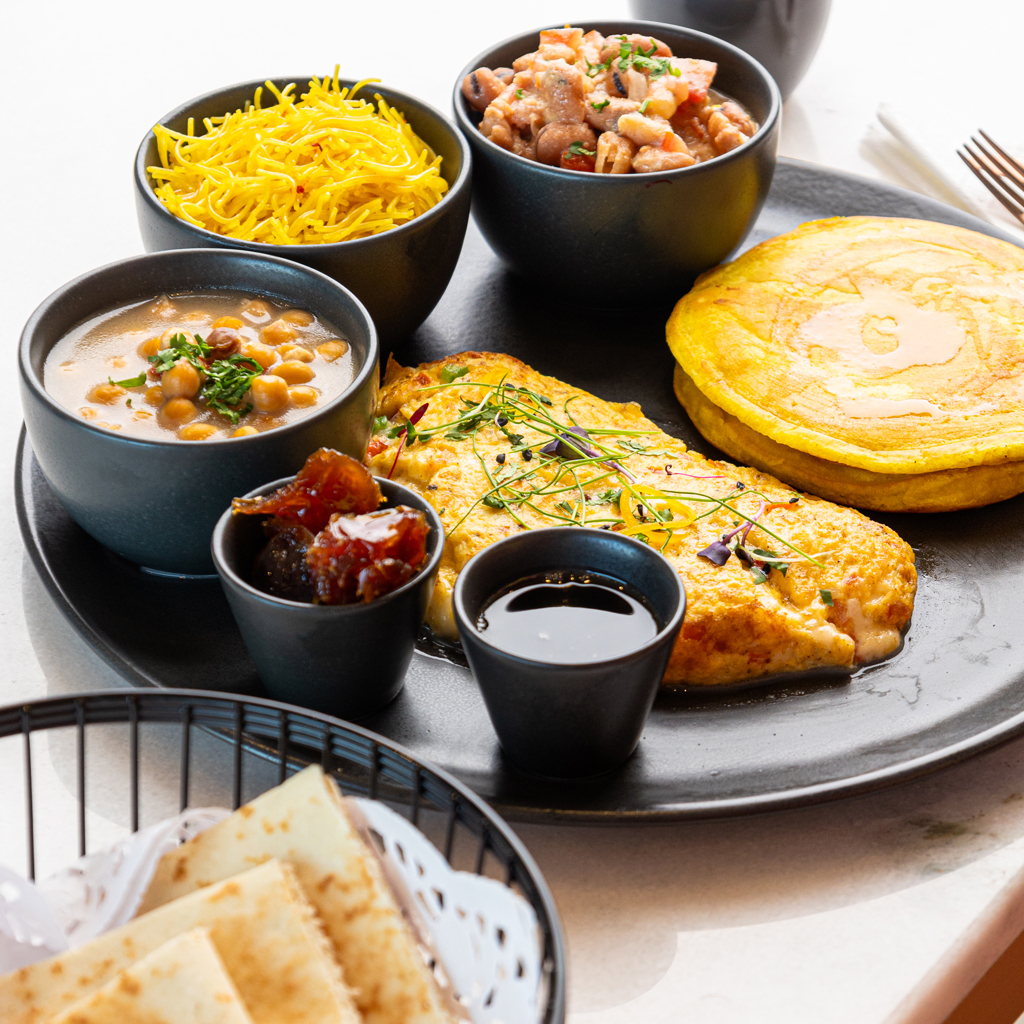 Traditional Emirati fare consisting of 3 eggs (as you like), chebab, balaleet, chickpeas. premium dates, maple syrup. Served with warm arabic bread and your choice of coffee or tea.