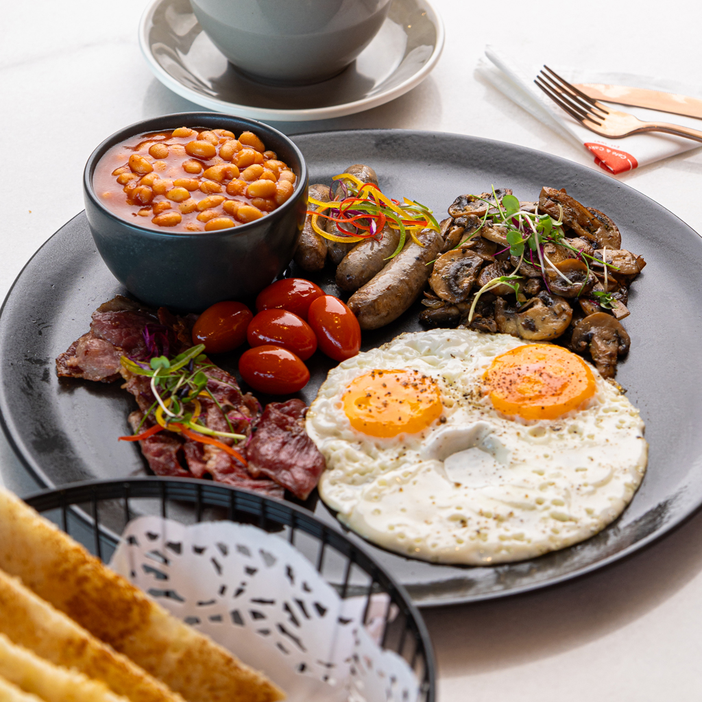 Traditional english fare consisting of three eggs (as you like), soft/crispy bacon. fried/grilled tomatoes, sautéed mushrooms. and sausages. Served with warm toast and your choice of coffee ro tea.